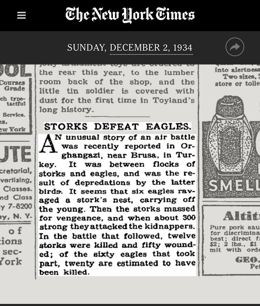 Did you know that in 1934, a remarkable event unfolded in Turkey where eagles and storks engaged in a battle that lasted for days?